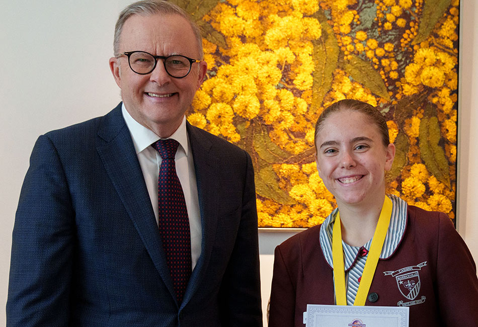 2023 National History Challenge Award recipient Olivia Tsigaropoulos with Australian Prime Minister Anthony Albanese. jaderamirezsydcatholiceduau FacebookXLinkedInPinterestEmail